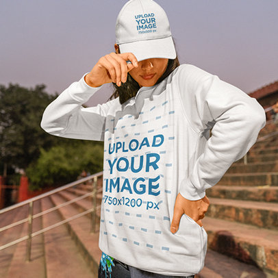 Comfort Colors Mockup of a Woman Hiding Half Her Face With a Hoodie in a Studio